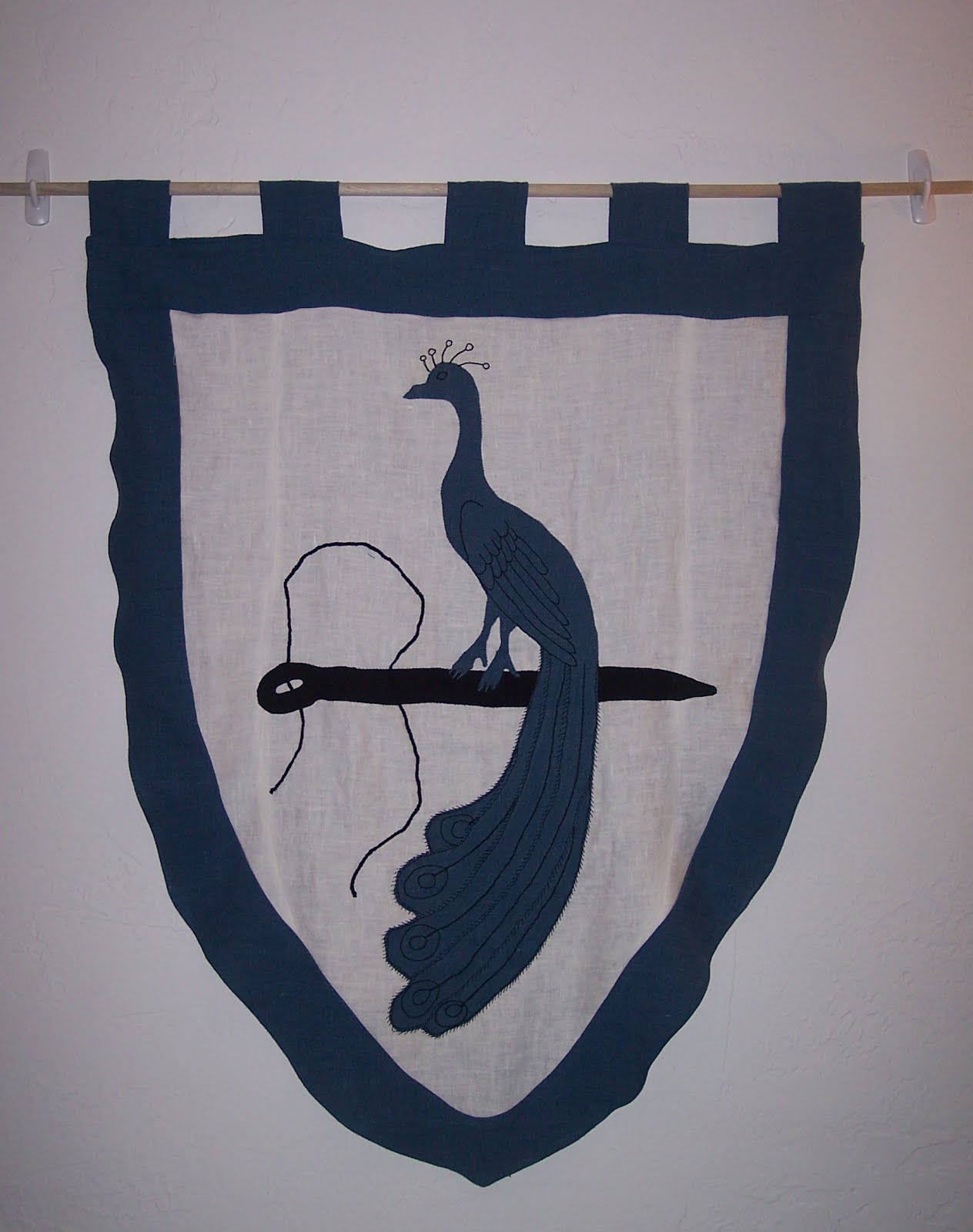 It's made of linen. I appliqued the needle and peacock onto the white background by hand. I basically just folded the edges under and whip stitched it down. Then I stitched the blue border around the white field, and attached the back lining and the top loops by machine. The feet were especially tricky, but I think it turned out well.